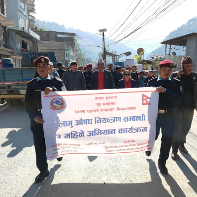 जिल्ला प्रशासन कार्यलय सिन्धुपाल्चोकले लागुऔषध दुव्र्यसनी विरुद्ध सचेतना कार्यक्रम गरेको छ । बाह्रबिसे नगरपालिकामा बिहिबार लागु औषध बिरुद्धमा बिभिन्न नाराहरुका साथ बजार परिक्रमा गरेर कवर्डहलमा गई लागु पदार्थ बिरुद्धको सचेतना कार्यक्रम गरेको हो । बाह्रबिसे नगरपालिकाका प्रमुख बालकृष्ण बस्नेतको प्रमुख अतिथ्यतामा र उपप्रमुख मन्जु तामाङको बिशेष अतिथ्यतामा यो कार्यक्रम भएको हो । प्रमुख जिल्ला अधिकारी किरण थापाको सभापतित्वमा भएको कार्यक्रममा जिल्ला प्रहरी कार्यलय तथा सुरक्षा निकायका प्रमुखहरु बाह्रबिसे नगरपालिकाका कार्यपालिकाका पदाधिकारीहरु वडा अध्यक्षहरु बिद्यार्थी शिक्षक अभिभावकहरुको उपस्थिती रहेको थियो ।