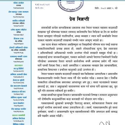 शाखाका सचिव रमेश कुमार बोहोराले एक विज्ञप्ति जारी गर्दै उक्त घटना केवल व्यक्तिगत रिसइवी वा असहिष्णुताको परिणाम नभई स्वतन्त्र पत्रकारितामाथिको प्रत्यक्ष हमला भएको ठहर गरेको छ । विज्ञप्तिमा भनिएको छ, “यस प्रकारको आपत्तिजनक व्यवहारले लोकतान्त्रिक मूल्य, प्रेस स्वतन्त्रता र अभिव्यक्तिको अधिकारमा गम्भीर आघात पुर्याएको छ, जुन कुनै हालतमा स्वीकार्य छैन ।”शाखाका अनुसार पत्रकार बस्नेतले आफ्नो पेशागत जिम्मेवारी निर्वाह गरिरहेका बेला अपशब्द प्रयोग गर्दै ज्यान मार्ने धम्की दिएका थिए । शाखाले यस्तो आक्रामक र अमर्यादित व्यवहार प्रेस आचारसंहिता, सामाजिक शिष्टाचार र प्रचलित कानुनको स्पष्ट उल्लंघन भएको बताएको छ ।घटनाप्रति गम्भीर चिन्ता प्रकट गर्दै शाखाले दोषीलाई कानुनी दायरामा ल्याउन जोडदार माग गरेको छ । विज्ञप्तिमा भनिएको छ, “स्वतन्त्र प्रेस र निर्भीक पत्रकारिता लोकतान्त्रिक समाजका आधारस्तम्भ हुन् । यस्ता घटनाले पत्रकारहरूलाई त्रास, डर र असुरक्षाको वातावरणमा काम गर्न बाध्य पार्दछ, जुन हामीलाई कुनै हालतमा स्वीकार्य छैन ।”महासंघ काठमाडौं शाखाले घटनाको निष्पक्ष र शीघ्र अनुसन्धान गरी दोषीमाथि कानुनी कारबाही सुनिश्चित गर्न सुरक्षा निकाय र प्रशासनसँग आग्रह गरेको छ । साथै, यस्ता घटनाप्रति शून्य सहनशीलताको नीति अवलम्बन गर्न सरकार, सरोकारवाला निकाय र सम्पूर्ण नागरिक समाजसँग समेत अपिल गरेको छ ।