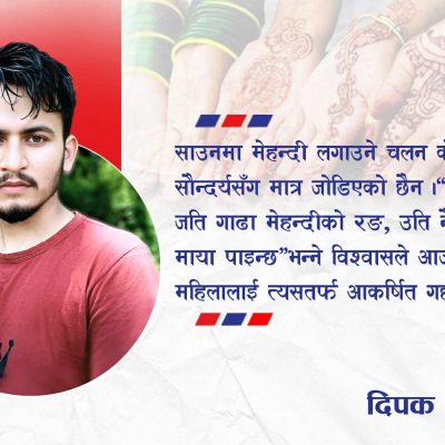 साउनमा मेहन्दी, चुरा, साडी र व्रतको चलन केवल परम्परा पालना मात्रै होइन, जीवनशैलीमै रमाएको एउटा सांस्कृतिक अभ्यास हो। हरियो रङलाई प्रेम र वातावरणसँग, रातोलाई सौभाग्यसँग, र पहेंलोलाई पवित्रता र उज्यालो सोचसँग जोडिन्छ।“हत्केलामा जति गाढो मेहन्दीको रङ, उति नै श्रीमानको माया पाइन्छ” भन्ने विश्वासले आज पनि धेरै महिलालाई मेहन्दीतर्फ आकर्षित गर्छ। साउनको पहिलो सोमबारदेखि नै व्रत बस्ने, शिवालयमा जल अर्पण गर्ने र शृंगारमा रमाउने नारीहरूको यो समर्पणले समाजमा धार्मिक चेतना र सांस्कृतिक सजीवता थप बलियो बनाउँछ। पौराणिक विश्वास अनुसार, साउन महिनामा पार्वतीले कठोर व्रत गरी भगवान शिवलाई पति रूपमा प्राप्त गरेकी थिइन्। त्यसैले आज पनि विवाहित तथा अविवाहित महिलाहरू यस महिनामा शिवको आराधना गरी आफ्नो जीवनमा प्रेम, सौभाग्य र दीर्घायुको कामना गर्छन्। साउन केवल मौसमको परिवर्तन होइन, यो हाम्रो परम्परा, आस्था, प्रकृति र प्रेमसँग जोडिएको महिना हो। महिलाहरूको सिंगार, मेहन्दी, चुरा र व्रतको यो उत्सव केवल बाह्य आवरण होइन यसले समाजमा संस्कार, श्रद्धा र नारीशक्तिको गहिरो सन्देश बोकेको छ। यस साउनमा हामी सबैले प्रकृतिको सौन्दर्यसँगै आ–आफ्नो परम्पराको सम्मान गर्दै, समाजमा सकारात्मक ऊर्जा फैलाउने प्रण गरौं।