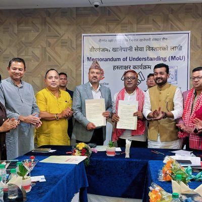 वीरगञ्ज (पर्सा), १ साउन : खानेपानी मन्त्रालय अन्तरगतको नेपाल खानेपानी संस्थान र वीरगञ्ज महानगरपालिकाबीच वीरगञ्जमा खानेपानी सेवा विस्तारका लागि एक महत्वपूर्ण समझदारीपत्रमा हस्ताक्षर भएको छ ।खानेपानीमन्त्री प्रदीप यादवको विशेष उपस्थितिमा नेपाल खानेपानी संस्थानका तर्फबाट महाप्रवन्धक अर्जुनबाबु ढकाल तथा वीरगञ्ज महानगरपालिका तर्फबाट प्रमुख प्रशासकीय अधिकृत अरविन्द लाल कर्णले उक्त समझदारीपत्रमा हस्ताक्षर गर्नु भएको हो ।