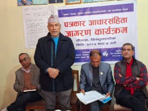 यसै गरी प्रेस काउन्सिल नेपालका सह प्रशासकिय अधिकृतसुचना अधिकृत सह प्रबक्ता राम शरण बोहोराले आचारसंहिताबारे प्रस्तुतिकरण गर्नु हुँदै सञ्चार कर्मीहरुको नामबाट प्रयोग हुने सामाजिक सञ्जालले सञ्चार गृहको प्रतिनिधीत्व नगर्ने भएकाले यस तर्फ ध्यान दिन र समाजमा बिकृती फैलाउँने, बिना प्रमाण एक अर्कालाइ असर पर्ने कसैको पनी ब्यक्तीगत वा सस्थागत रुपमा असर पर्ने खालका समाचार सम्प्रेशण गर्न नपाइने भन्नु हुँदै सबै सञ्चार गृहहरु कानुन बमोजिम सम्बन्धीत निकायमा दर्ता गरेर मात्र सञ्चालन गर्न पर्ने बताउँनु भयो । सो अबशरमा बोहोराले काउन्सिलमा दफा ६ को व्यवस्थाअनुसार ७ सय ५० वटा उजुरी परेको जसमध्ये ६ सय ५० वटा आचारसंहिता विपरित पाइएको बताउँनु हुँदै आचारसििंहता उलंघन गर्ने संचार हरु र सञ्चारकर्मीहरुलाई आवश्यक कार्बाही गरिएको समेत बताउँनु भयो ।