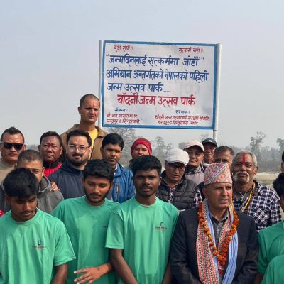 जन्मदिनलाई सत्कर्ममा जोडौँ अभियान अन्तर्गत आज अभियानका केन्द्रिय संयोजक गोबिन्द चौलागाइको जन्म दिनका दिन रौतहट जिल्लाको चादिखोला नजिक निर्माणाधीन रहेकोे जन्मोत्सव पार्कमा बृक्ष रोपेर जन्मोत्सव मानाइएको छ । जन्म दिनको अबशरमा केन्द्रिय संयोजक बृक्ष रोप्न पुग्दा चुनावी अभियानमा उमेदवार बन्नु भएका सञ्चार कर्मी ऋृषि धमला चौलागाइलाइ शुभकामना दिनका लागी पार्कमै पुगेर बृक्ष रोपणमा सहभागी हुनु भएको थियो । सो हबशरमा चौलागाइलाइ शुभकामना दिदै धमला सहित सहभागी सबै मिलेर अभियानलाई ऐक्यवद्धता जनाउदै बृक्षरोपण गरिएको छ ।