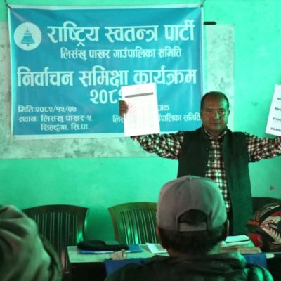 लिसंखु पाखार गाउँपालिका राष्ट्रिय स्वतन्त्र पार्टी (रास्वपा) ले निर्वाचनपछिको समिक्षा बैठक सम्पन्न गरेको छ । कार्यक्रममा विभिन्न वडाका प्रतिनिधि, कार्यकर्ता र स्थानीय मतदाताको उल्लेख्य उपस्थिति रहेको थियो ।