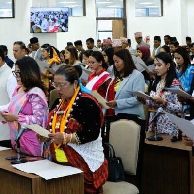 काठमाडौँ, १२ चैतः नवनिर्वाचित प्रतिनिधिसभा सदस्यहरुले पद तथा गोपनीयताको शपथ लिनुभएको छ । सिंहदरबारस्थित सङ्घीय संसद् सचिवालयको नवनिर्मित बहुउद्देश्यीय हलमा आज आयोजित समारोहमा प्रतिनिधिसभाका ज्येष्ठ सदस्य अर्जुननरसिंह केसीले उहाँहरुलाई पद तथा गोपनीयताको शपथ गराउनुभएको हो ।