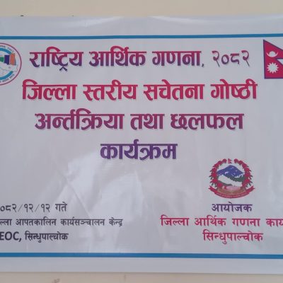 राष्ट्रिय आर्थिक गणना २०८२ सम्बन्धी सचेतना कार्यक्रम सिन्धुपाल्चोकमा सम्पन्न सिन्धुपाल्चोक — राष्ट्रिय तथ्याङ्क कार्यालयद्वारा सञ्चालन हुन लागेको राष्ट्रिय आर्थिक गणना २०८२ सम्बन्धी जिल्ला स्तरीय सचेतना गोष्ठी, अन्तरक्रिया तथा छलफल कार्यक्रम सिन्धुपाल्चोकमा सम्पन्न भएको छ। कार्यक्रममा आर्थिक गणनाको उद्देश्य, तथ्याङ्क सङ्कलन विधि, गणनामा समावेश गरिने क्षेत्रहरू तथा यसको महत्वबारे विस्तृत जानकारी प्रदान गरिएको थियो।