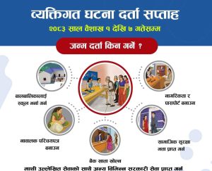 व्यक्तिको कानुनी पहिचान, नीति निर्माण र राज्यबाट प्रवाह हुने सेवा प्राप्तिका लागि व्यक्तिगत घटना दर्ता महत्त्वपूर्ण आधारको रूपमा रहेको छ । यसैकारण सबै स्थानीय तहले व्यक्तिगत घटना दर्ता सप्ताह मनाउन लागेका हुन् । त्यसक्रममा विद्यालय तथा स्थानीय सङ्घ संस्थाले व्यक्तिगत घटना दर्ताको महत्त्वबारे सचेतना अभिवृद्धिका साथै विविध कार्यक्रम आयोजना गर्ने विभागले जनाएको छ । विभागले गत चैतको अन्तिम साता नै सबै स्थानीय तहलाई परिपत्र गर्दै विविध कार्यक्रमसहित सप्ताह मनाउन आग्रह गरिसकेको छ ।